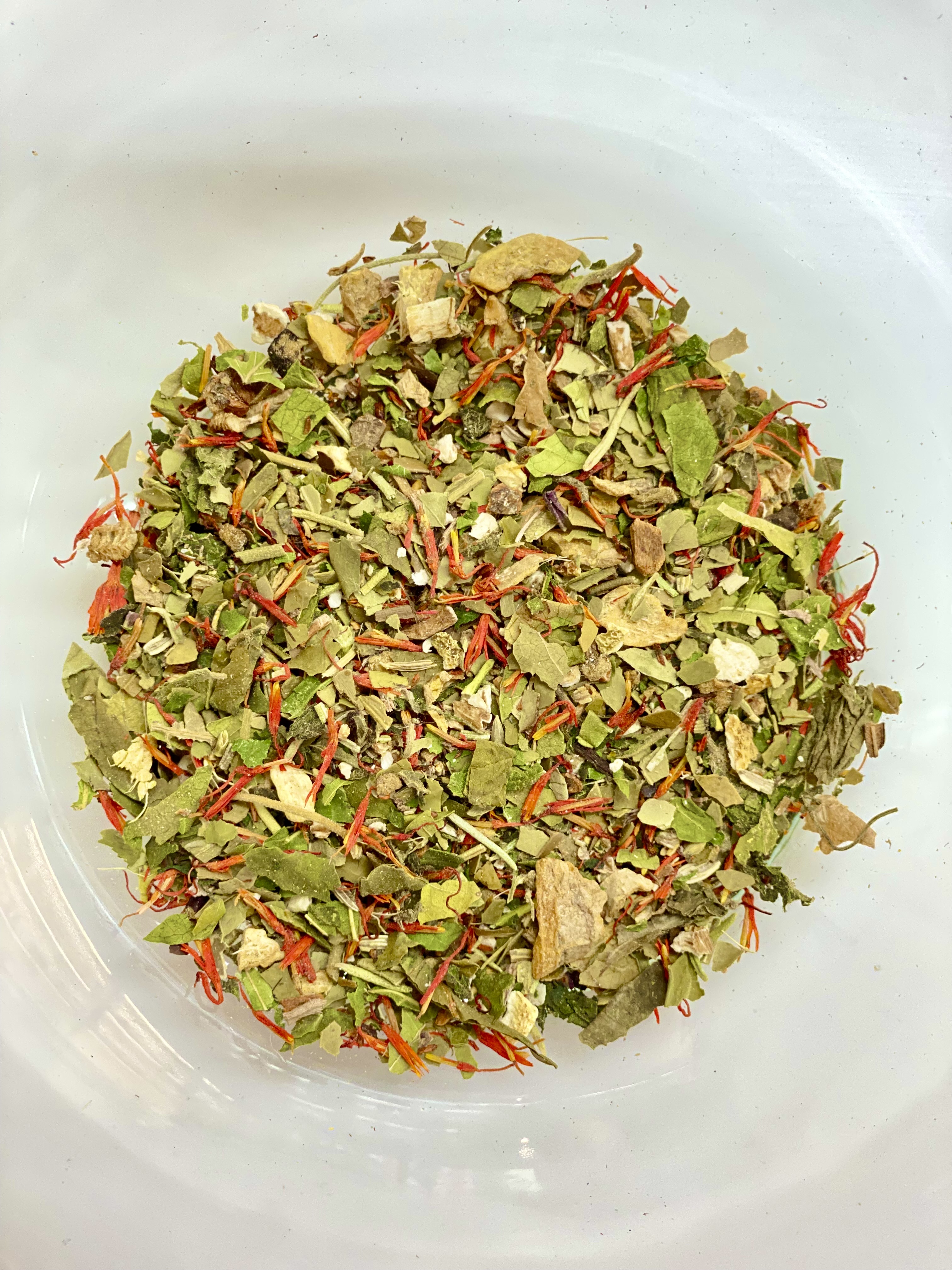 スパイシーなお茶風味で、身体の芯からポカポカと温まり、余分なものが燃えるような感覚と共に滞っていた巡りに喝が入り、ハーブのパワフルなエネルギーが全身の細胞に広がるようなハーブティーです。